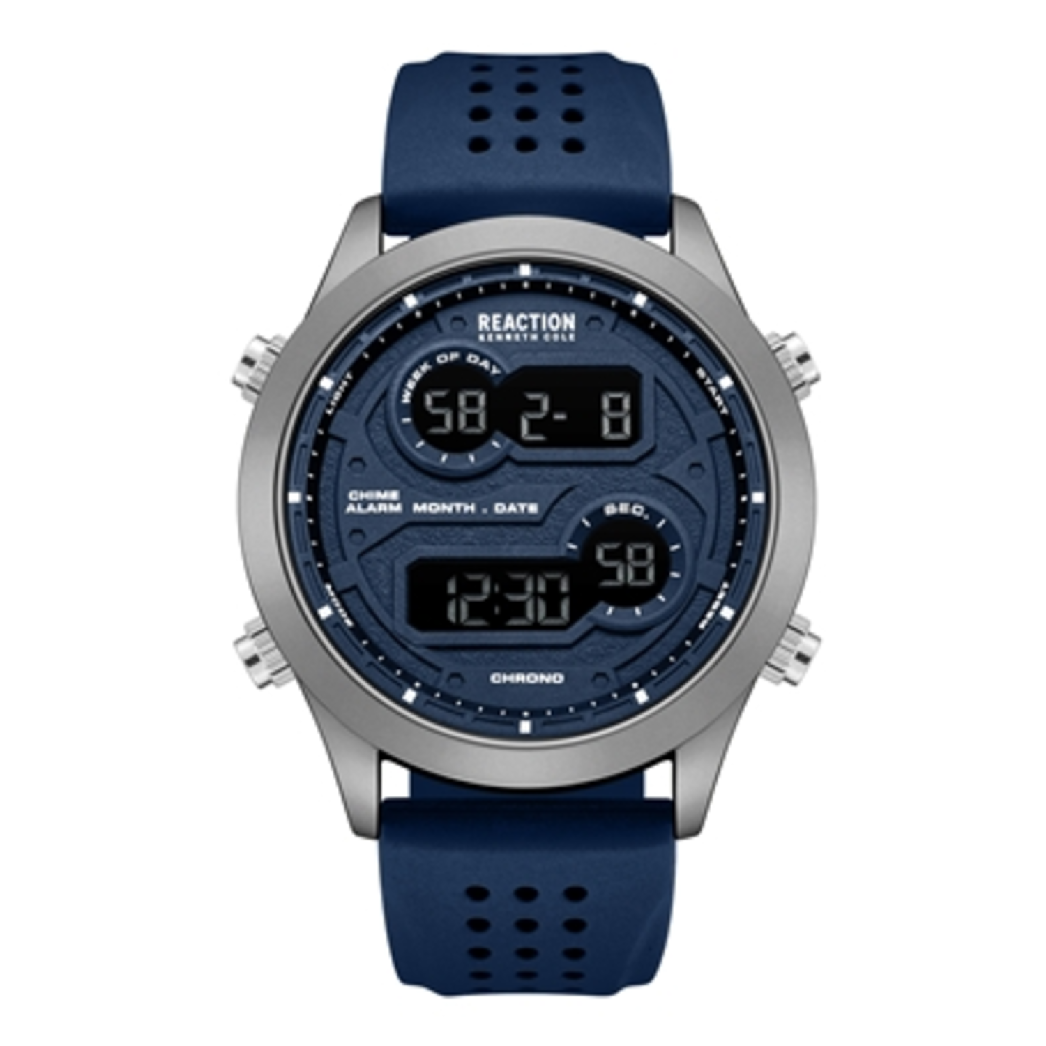 Kenneth Cole Reaction digital watch features a gun metal-tone 47mm case. The all digital LCD black dial has multiple functions including the time, day, date, and an alarm. The watch is completed with a blue silicone strap.