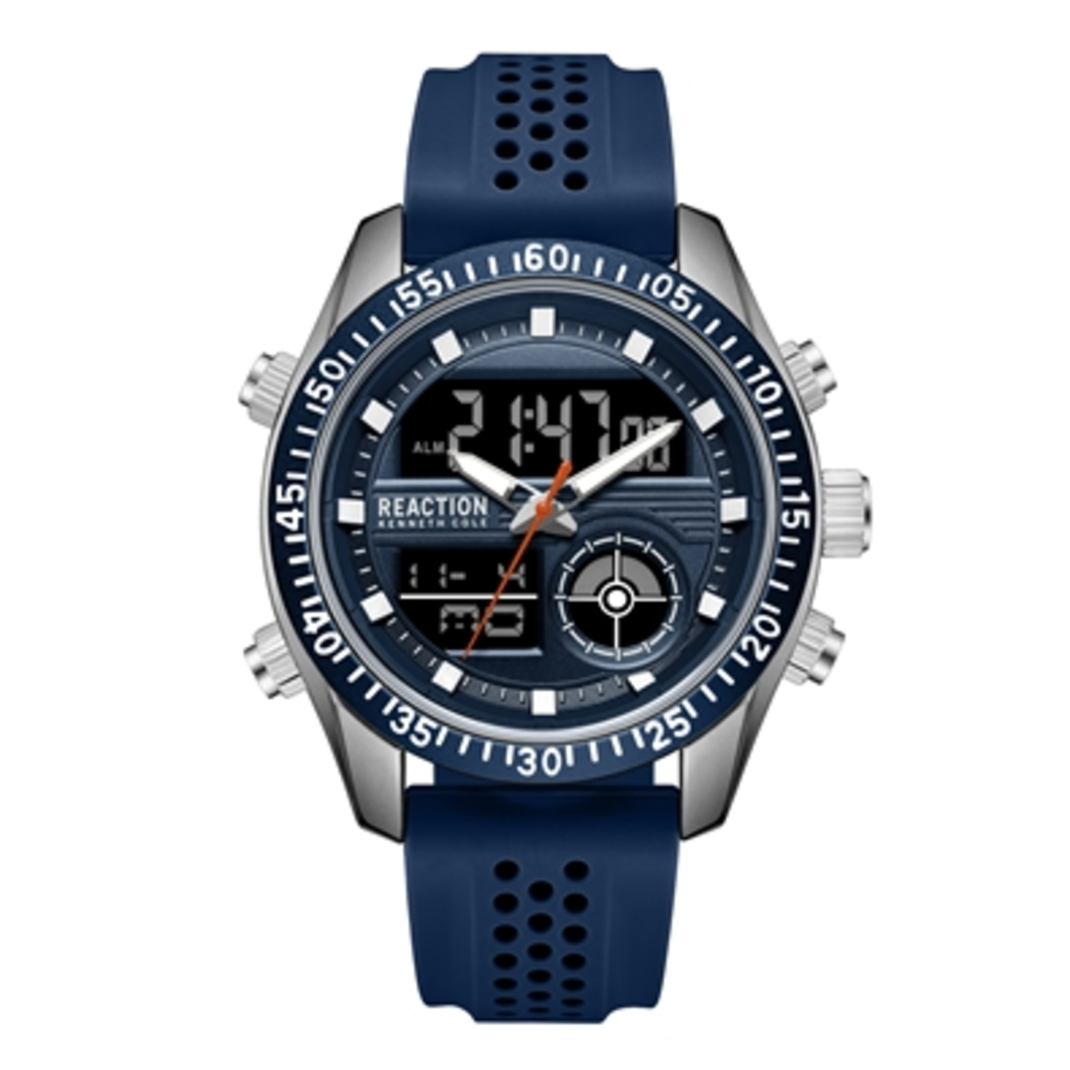 Kenneth Cole Reaction men's analog and digital watch features a two-tone gun metal and blue 45.2mm case. The blue dial is accented with three digital displays each with their own functionality. The watch is completed with a textured blue silicone strap.