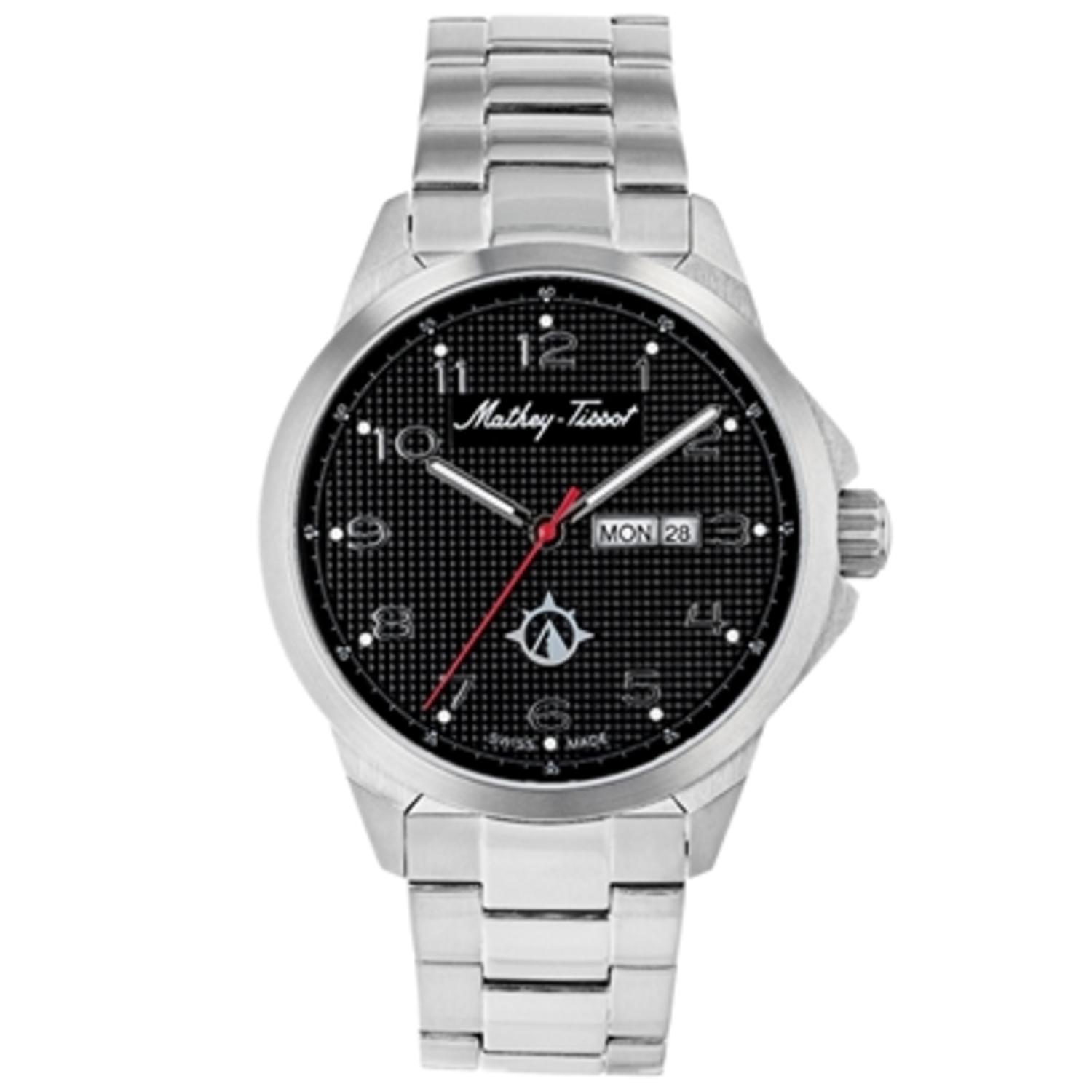 Since 1886, Swiss watch brand Mathey Tissot has produced prestigious time pieces known for their quality and craftsmanship. The Excalibur collection watch features a 45mm silver stainless steel case. The black textured dial is accented with a day date window with options for both English and French language. The watch is complemented a stainless steel bracelet.