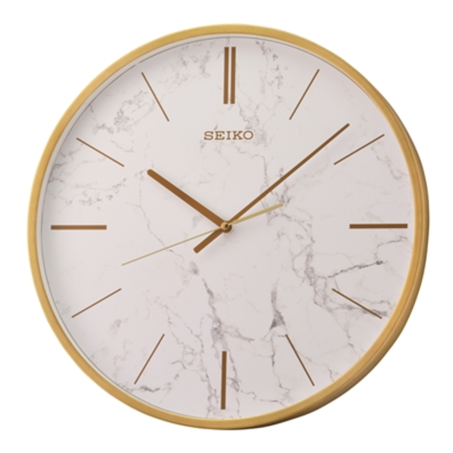 The 16" Carrara Wall clock is as elegant as its name. Evoking the look of white marble in a gold wall clock. Perfectly matches kitchen stone countertops or beautiful living rooms. Features include golden color numeral markings, quiet sweep and a glass cover.