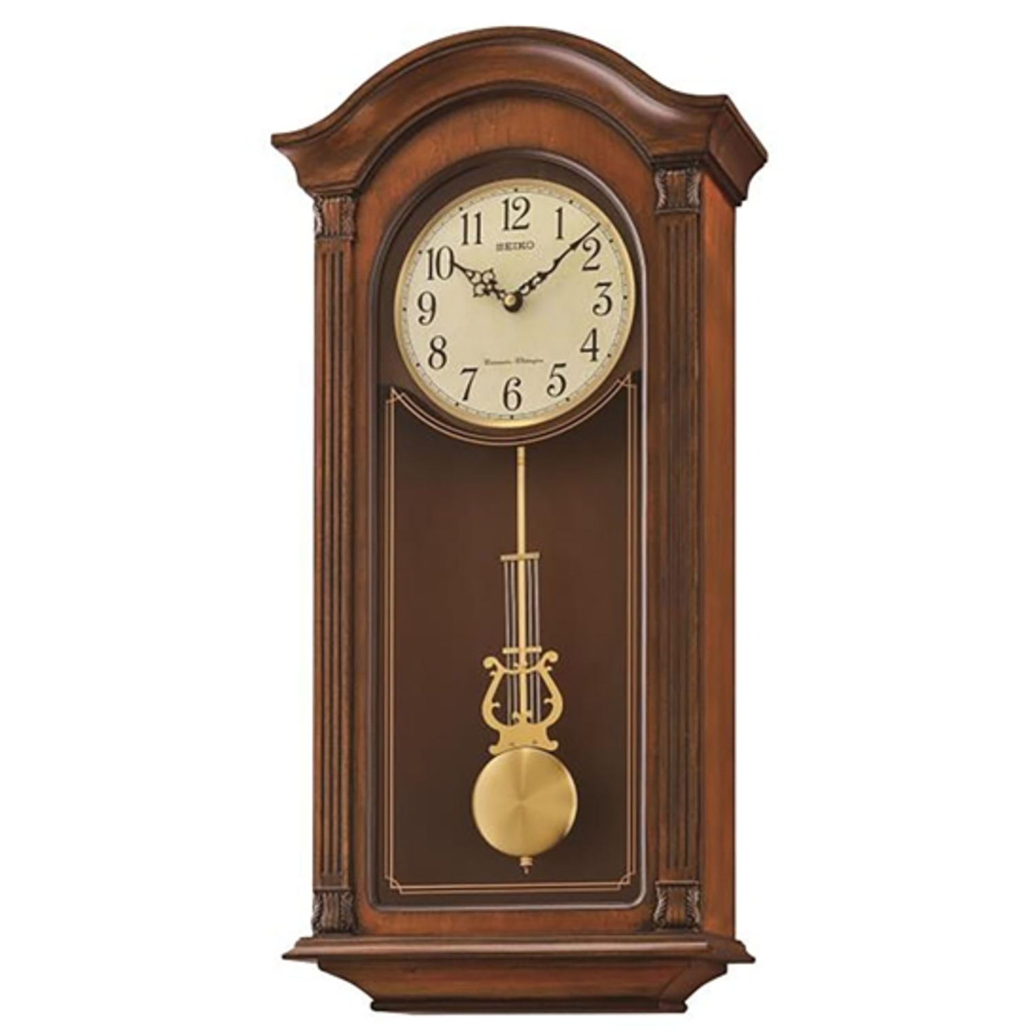 Add a touch of traditional elegance to your home with this pendulum wall clock with gold-tone accents. It features a Westminster/Whittington chime, volume control, and nighttime silencer.