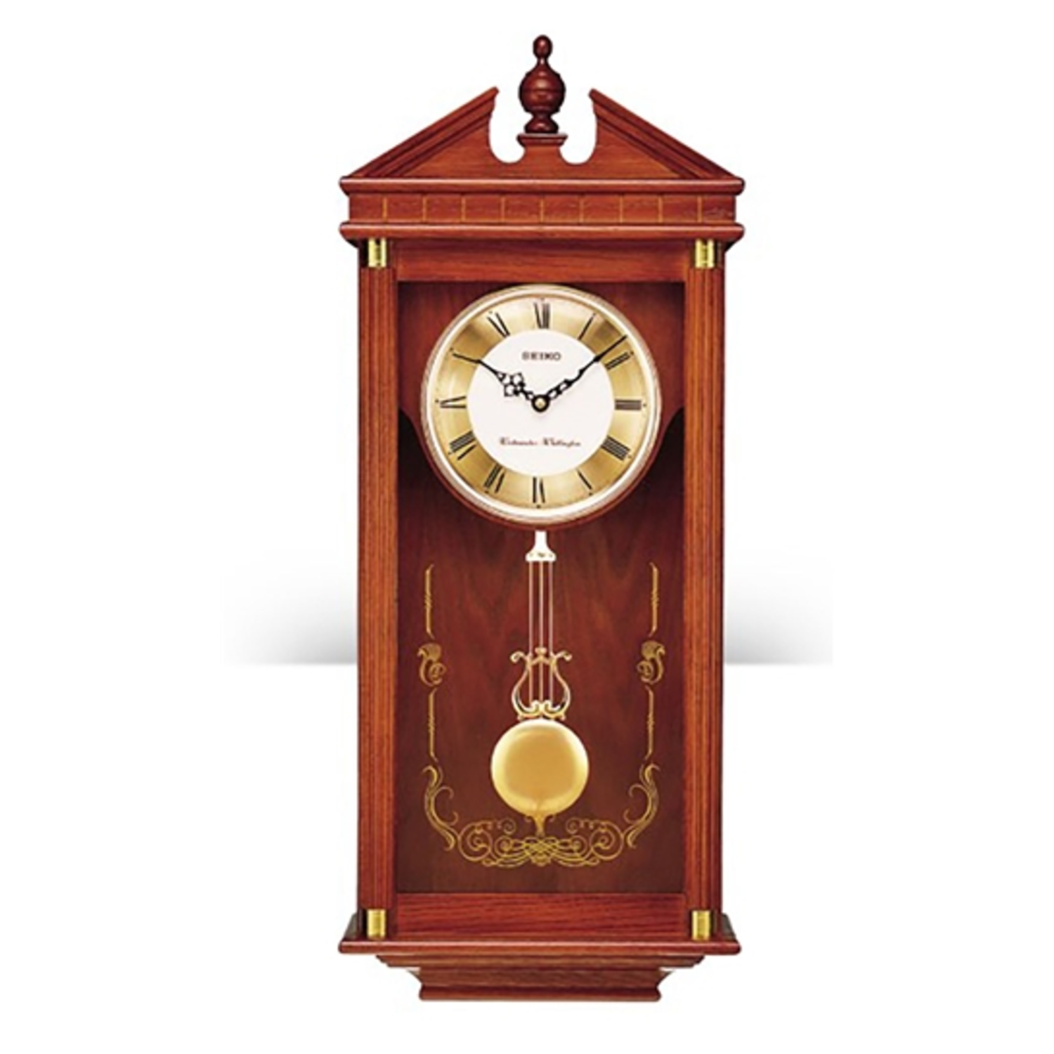 This regal solid oak wall clock with intricate wood carvings and golden details will upgrade your home. It also has columns on each side and metal accents. This clock features a beautiful Westminster/Whittington quarter-hour and hourly chime strikes with volume control as well as a nighttime chime silencer.