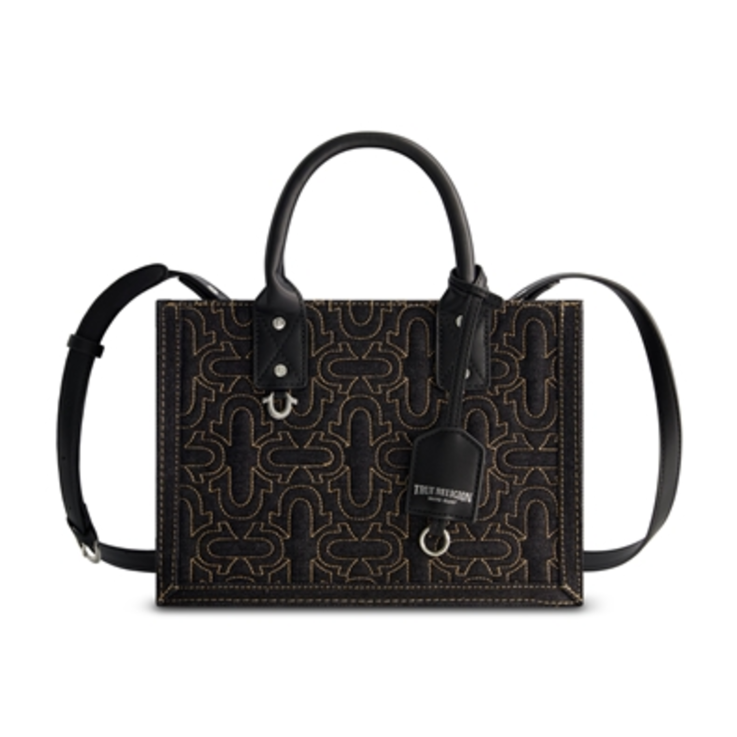 Keep your personal items conveniently accessible while exuding eye-catching style with the True Religion lady tote. This is an officially licensed True Religion product, ensuring that you are receiving genuine and authentic merchandise. 4" Handle drop. Silver Hardware. Magnetic snap closure. True Religion Signature polyester lining. Interior back wall slip pocket. Material: 50% polyester 50% Cotton. Dimension: 7.5H X 10.5W X 4D