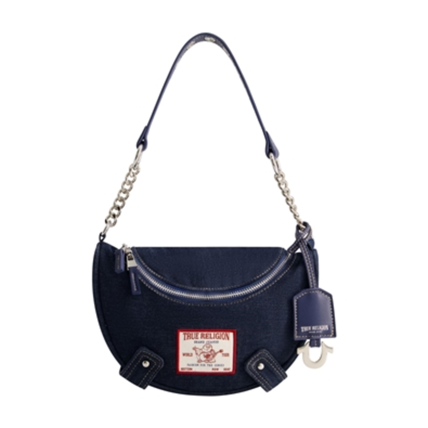 Keep your personal items conveniently accessible while exuding eye-catching style with the True Religion bag. This is an officially licensed True Religion product, ensuring that you are receiving genuine and authentic merchandise.-This True Religion Hobo is officially licensed. You are ensured to receive genuine and authentic merchandise.-9" handle drop-Silver Hardware-Zip closure-True Religion Signature Horse shoe polyester lining-Interior back wall zip pocket-Material 50% polyester 50%Cotton-Dimension:6.5H X 9.5W X 2.5D