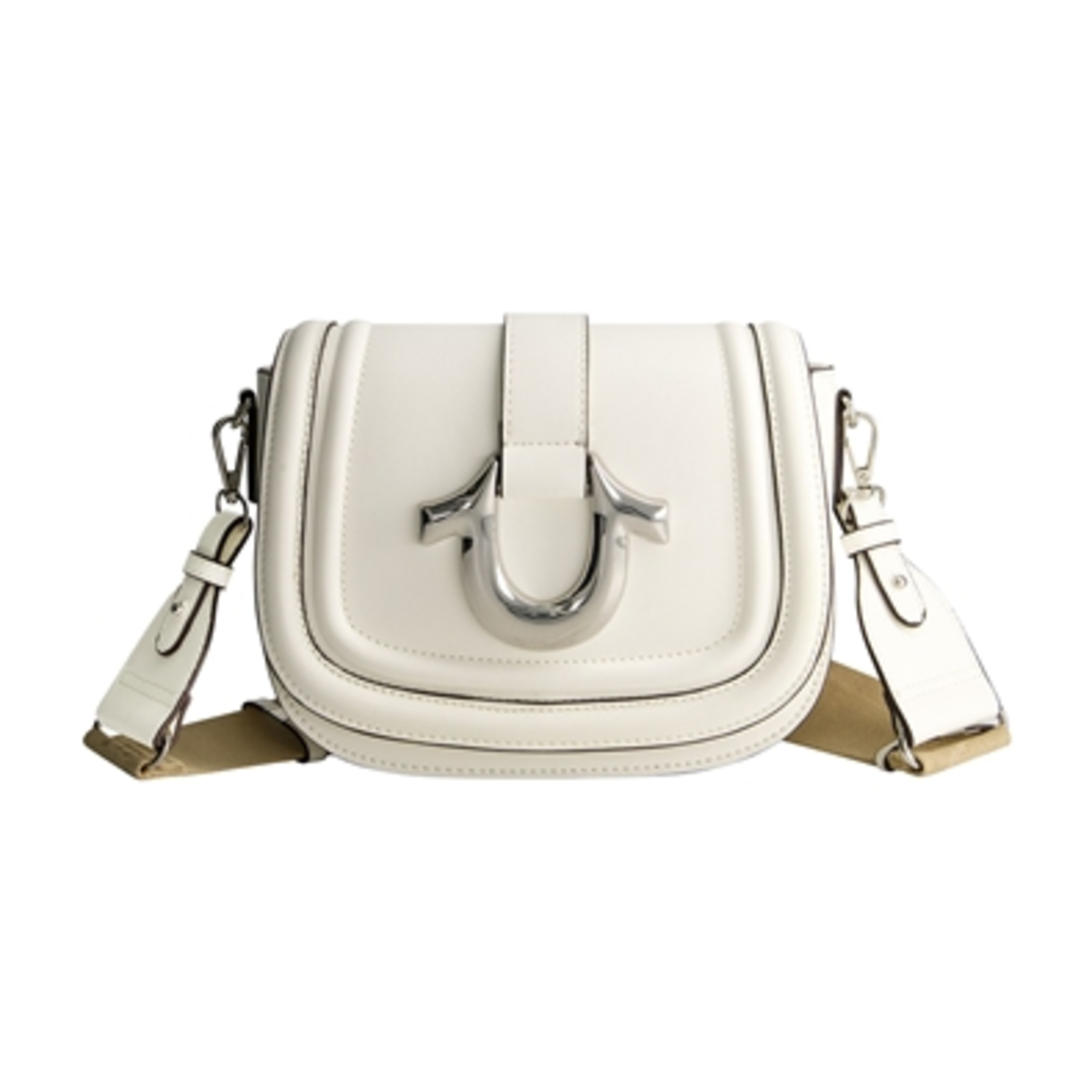 Make a bold statement with the True Religion Saddle Bag, featuring an oversized horseshoe emblem on the front flap. This stylish bag combines fashion and functionality with a sturdy adjustable shoulder strap and spacious interior, perfect for everyday essentials. The flap closure and interior zip pocket ensure secure storage, while gold-tone hardware adds a touch of luxury. Officially licensed, it guarantees genuine merchandise. The bag includes True Religion's signature polyester lining, with front and back slip pockets and a back wall zip pocket for organization. Made from 100% polypropylene, it measures 6.5"H x 9"W x 2.5"D and weighs 1 lb. Imported for quality.